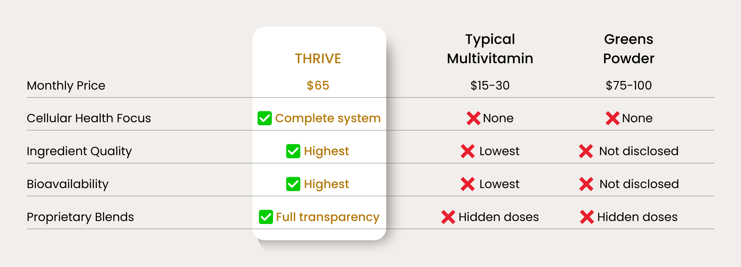 Basic multivitamins address none of these root causes. THRIVE targets all three.