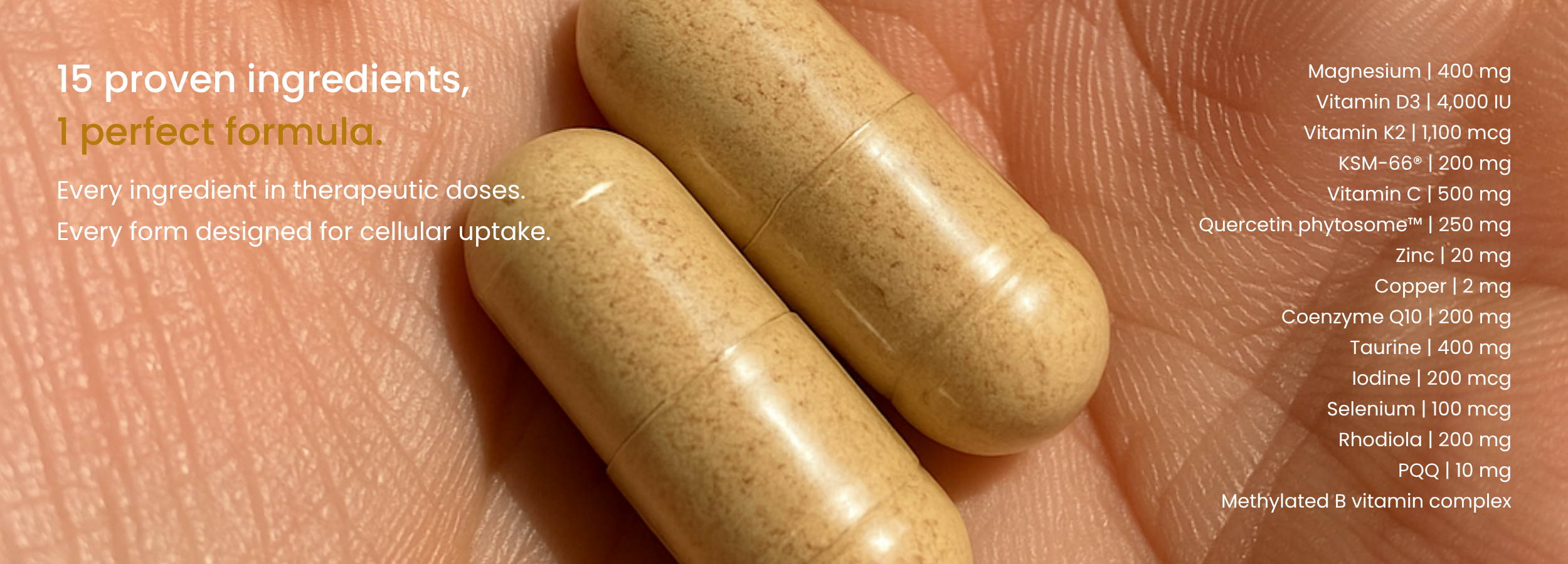 The only multivitamin designed around cellular health - targeting mitochondrial function and inflamm-aging with therapeutic doses of research-backed compounds.